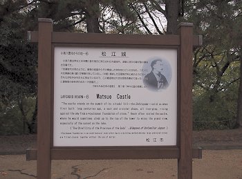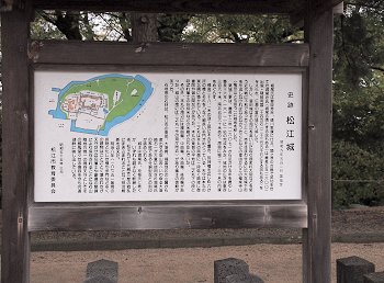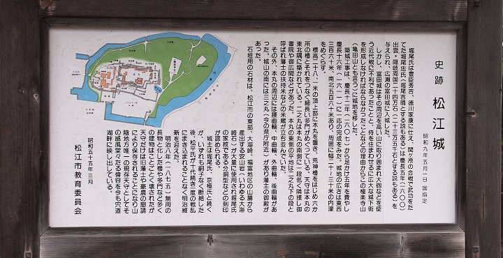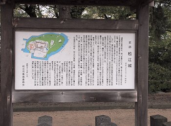 平山城で江戸時代には松江藩の藩庁として、出雲地方の政治経済の中心となったが、明治時代初頭に廃城令によって存城処分(陸軍省所管)となったため、天守以外の建物はすべて払い下げられ撤去された。城跡は現在、松江城山公園として利用され、また、江戸時代初期建造の天守を有する城跡であり、天守は山陰地方の現存例としては唯一である。天守からは宍道湖を眺望できる。天守内部には松江市街のミニチュア模型が展示されている。