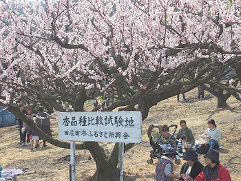 皆さんの後からノンビリと散策で、「杏品種比較試験地」までヤッて来ますと、さすがにここでは七〜八分咲きと言ったところでしょうか…