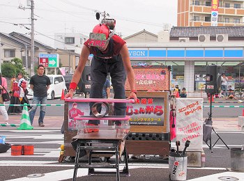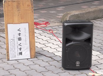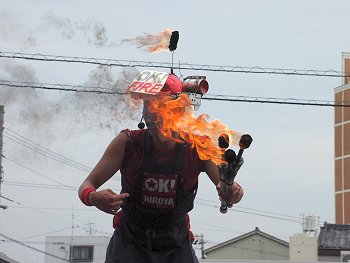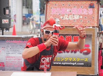 折角、大道芸にお付合いくださるのに「何言ってるかわからない!」ではふくやま大道芸のPRとしても困るので、この数年スピニングマスターズは発電機とバッテリーと両方を活用しています。