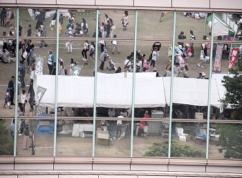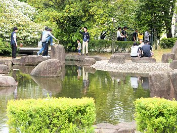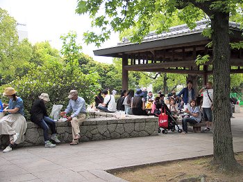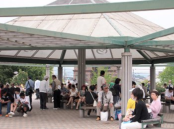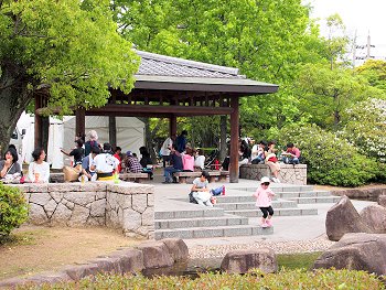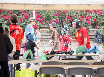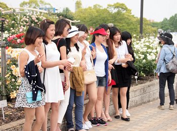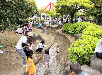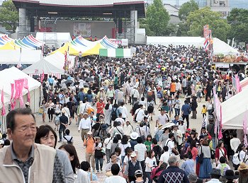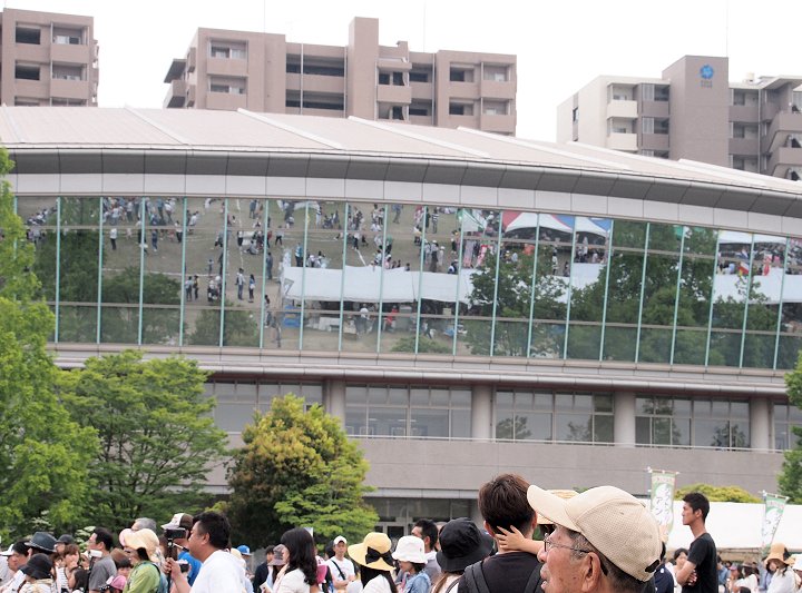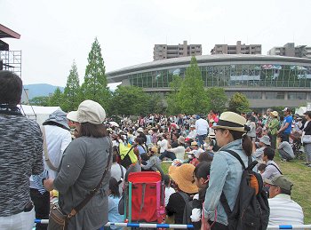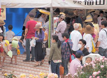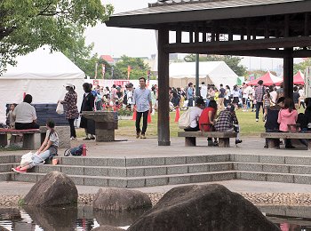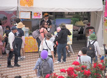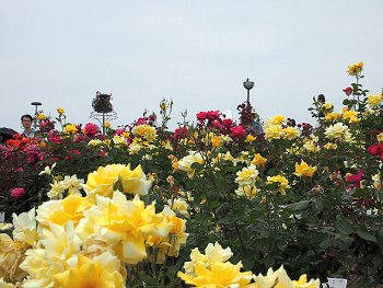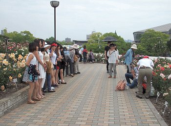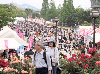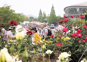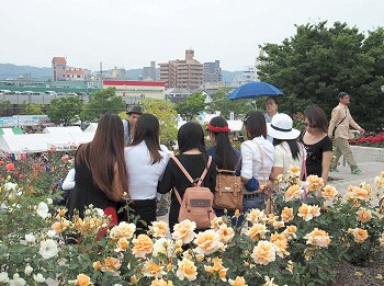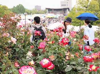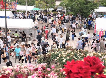 バラ花壇から芝生広場・ばらのステージ方向に眼を向けますと、年に一度の大混雑。色んな方々が色んな方法でバラ祭りを楽しんでおられます。