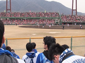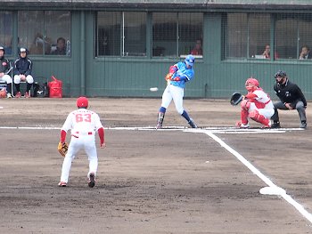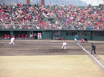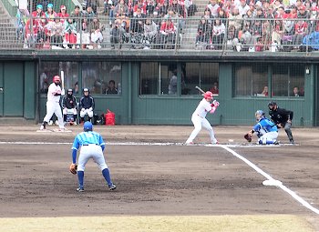ストライクコースは外れましたけど、充分、捕手のミットに届きました力強い球。いゃいゃ凄いですねぇ〜当然の事ながら、観客の皆様からは大きな歓声と同時に拍手。