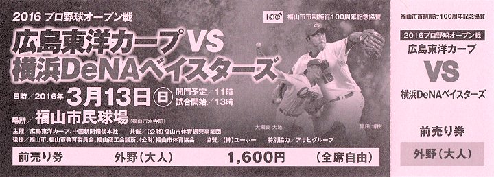 これは、先日、中国新聞販売店さんから頂きました、3/13(日)に開催の「広島東洋カープvs横浜DeNAベイスターズ」オープン戦の入場券。