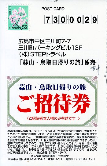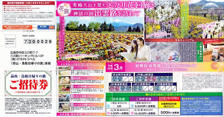 当選案内を確認してみますと「花旅『秀峰大山を望むとっとり花回廊』と『神話の国出雲路を訪ねて』」の日帰り旅行でありました(^_^)v