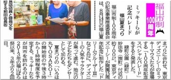 これは少し前の朝刊の記事なんですけど、ふ〜ん、福山市制100周年記念事業の一環として3年振りにミッキーが来福ですか(^_^)v