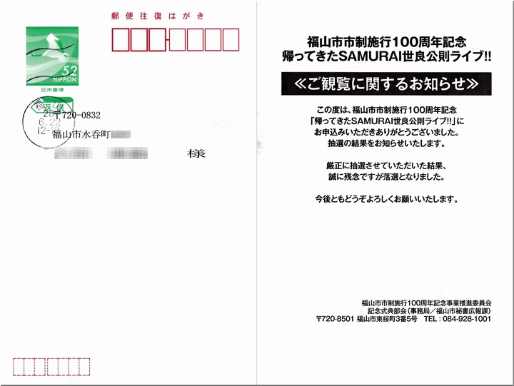 いつでしたか…福山市市制施行100周年祈念事業として「帰ってきたSAMURAI世良公則ライブ!!」の観覧者募集に応募しておりました。