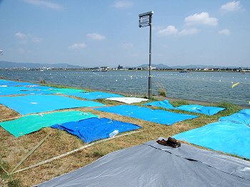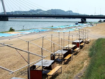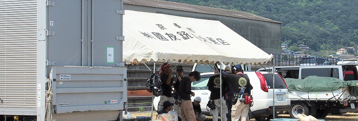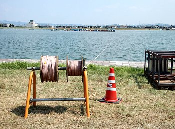 河川敷にテントを張られ、その付近におられました方に「今年は準備が段取りよくて早いですねぇ〜」と声を掛けますと、「あぁ、今回は打ち上げ本数も多いし、昨日から作業しているから…」との事でありました。
