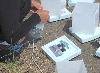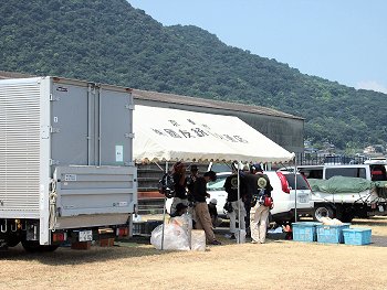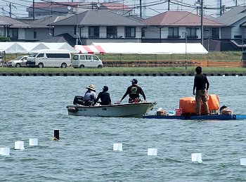 國友銃砲火薬店sanのテントより少し上流の河岸では、数名の方々が白い箱形の容器を整備中でありました(^.-)☆