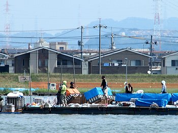例年ですと、この時間帯には皆さんお忙しく動いておられるのですけど、今年は随分段取り良さそうで、花火を設置しました台船は既に芦田川中央部に移動です。