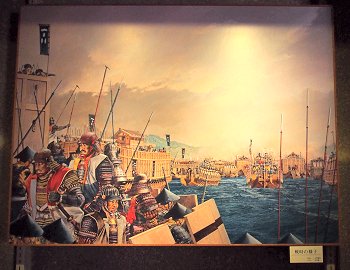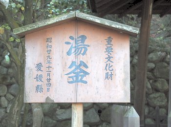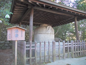 この湯釜に残る伝説があります。時は戦国時代。伊予の国も豪族どうしの戦乱に明け暮れていました。ある時、河野氏に逆らう豪族が湯築城付近で合戦をし、武士たちが湧き出る湯で血のついた刀を洗いました。と、湧き出していた温泉が止まったのですが、湯神社で祈願してもらうと、元のように噴き出しました。河野通直が感謝の気持ちで新たな湯釜を作ったのが亨禄4年だといいます。