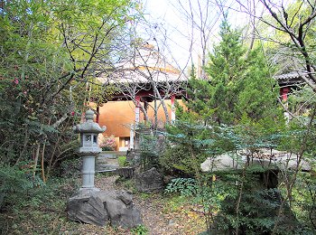 このマントラ塔に向かって左側の庭園には、隣接の建物方向に進入路が…