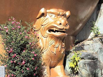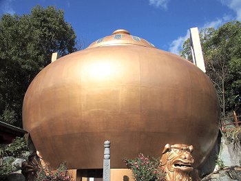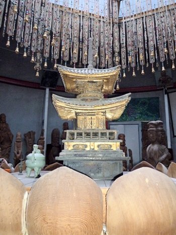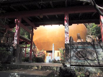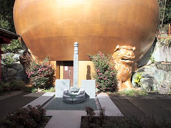 ゲートをくぐり進んで行きますと、金色に塗られたパンプキン型の建物。これが、マントラ塔なのでしょうネ(^.-)☆「ご自由に拝観ください」と書かれているので中に入れます。