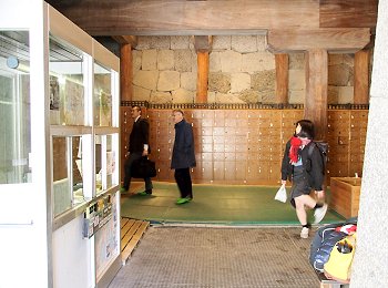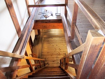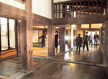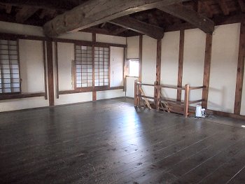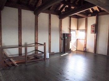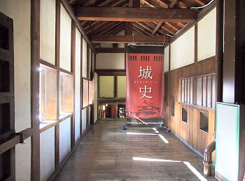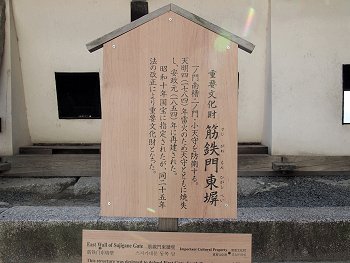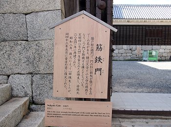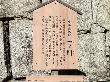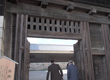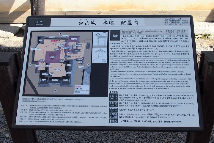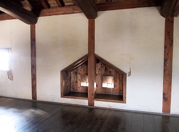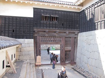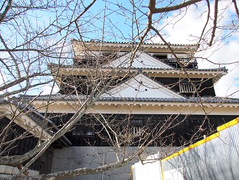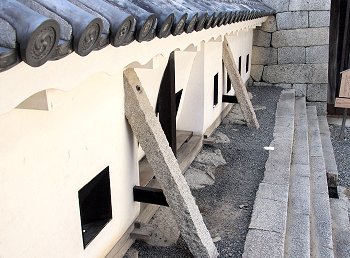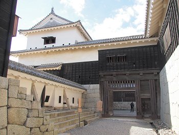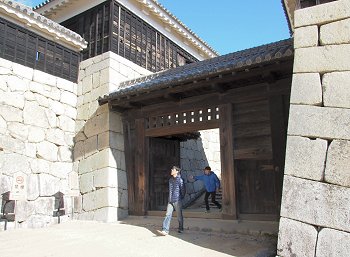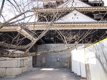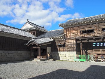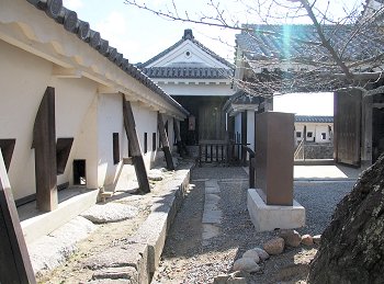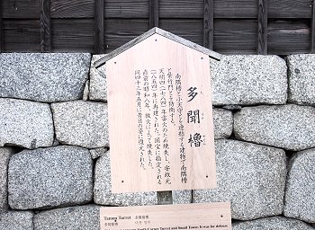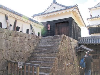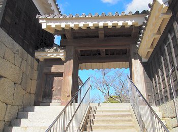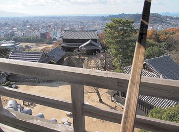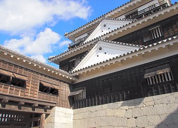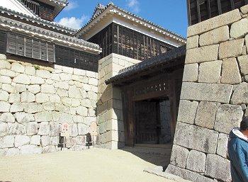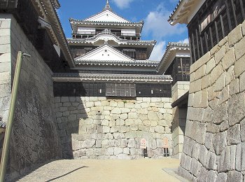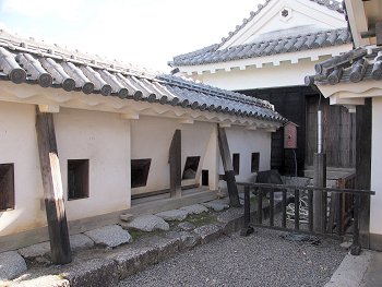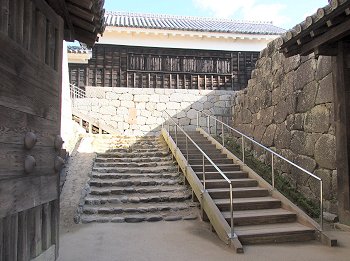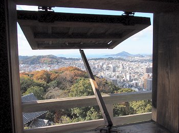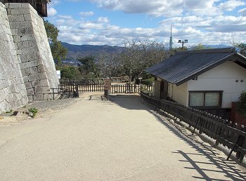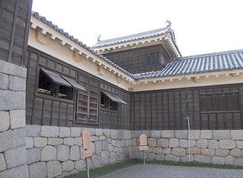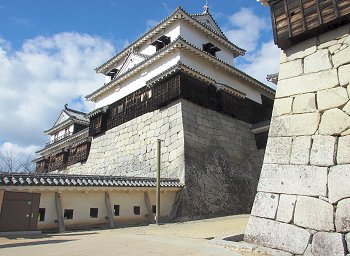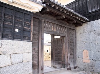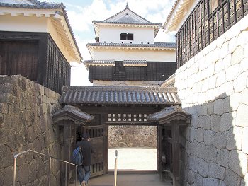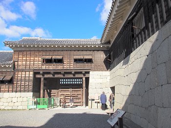 松山城本壇上の、北から西かけての北東面の防衛ラインの拠点にあるのが天神櫓で、艮門の状況を把握する役割も持っていた。社寺建築に用いられる正面扉様式(蔀戸・しとみど)があり、久松松平家の遠祖にあたる菅原道真を祀ったためこの名がある。(愛媛県松山市)