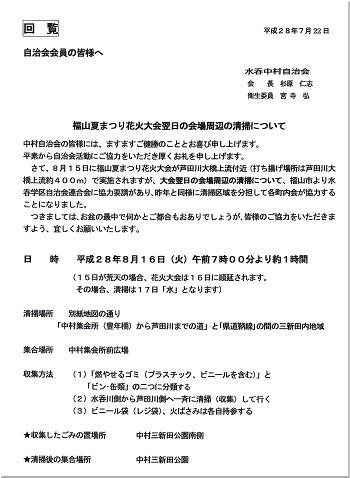 これも自治会の回覧文書なんですけど、うん、うん、毎年恒例の、花火大会翌日の会場周辺の清掃案内ですねぇ(^.-)☆