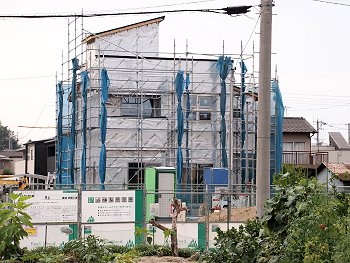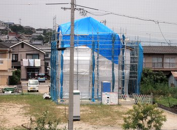 大型扇風機で涼を取ってはおられるのでしょうけど、さぞ暑いものとお察し致します。ですが、こぅして遠くから眺めておりますと、建物を築いて行かれます業務は楽しいだろぅなぁ〜と、いつも感じられてなりません。