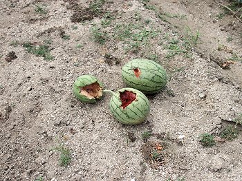 そして、「カラスでもないし、何だろう?…と、他の場所のスイカを確認してみたら、いくつか同じような被害。今までこんな事はないのに、ショック(^-^;」と続けます嫁さん。
