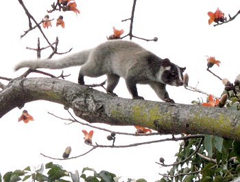 名前の由来になっているように、鼻筋に白いラインがあるハクビシン。尻尾が長く、短足・胴長で一見鈍そうにも見えますが、ジャコウネコ科だけあってネコのようなしなやかさを持っており、垂直にジャンプしたり、柱や壁をよじ登り電線を渡るなど、高い身体能力が特徴的です。雑食性で特に甘い果実が好物。そのため庭やハウス栽培の農作物への被害が多発しています。屋根裏に棲み着く害獣としても知られています。