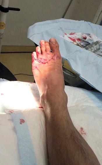 で、サメに噛まれました左足(小指の骨が見えていたようです)の縫合直後の状態を撮られた画像を送信して貰い、負傷時の状況を説明して貰いましたとか…