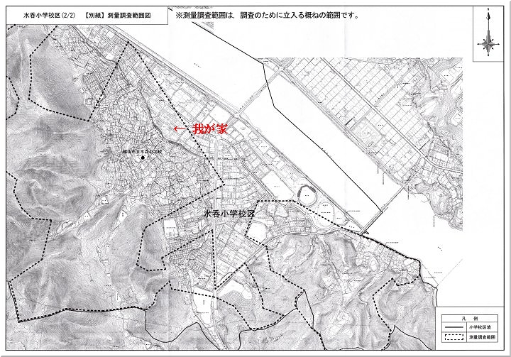 同封の測量調査範囲図に眼を通してみますと、なるほど我が家は、かろうじてこの区域に入っていますようですねぇ〜