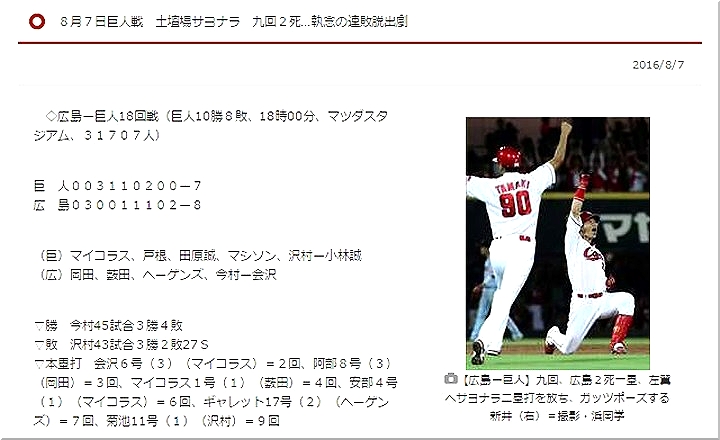 広島は8月7日、マツダスタジアムで巨人と対戦。新井貴浩内野手に劇的なサヨナラ打が飛び出し、8-7で勝利した。