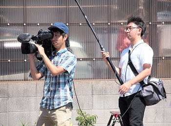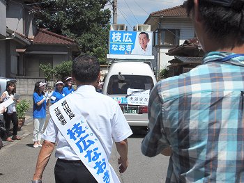 枝広候補が演説を終え、集まっておられます聴衆の皆様に握手して廻られました。その様子をブルーの上着、そして胸にワッペンの女性カメラマンが追尾。