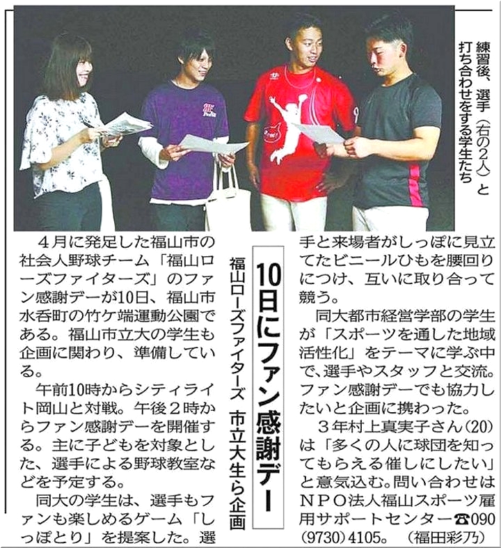 野球と雇用の受け皿となる企業を組み合わせ若者を呼び込む試みが広島県福山市で今春始まる。4月に地元企業が会員となるNPO法人「福山スポーツ雇用サポートセンター」が発足、社会人球団「福山ローズファイターズ」を運営する。選手は会員企業の社員として引退後も働くことができる。夢と職を提供、地域活性化を目指す。