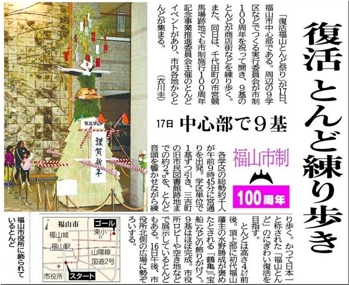 全国的に有名になった勇壮なデザインを競う福山とんど祭りは、元和8年(1622年)水野勝成が福山開城したとき、築城完成を祝って町衆がとんどをかついで城主の入城を祝したのにはじまります。(それ以前は、とんどをかついで練り歩きながら、通りで二基のとんどが出会うと自分の村のとんどを無理の通そうとする「けんかとんど」の記録があります。)