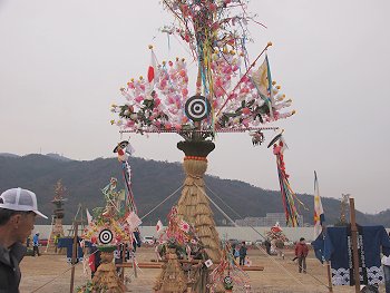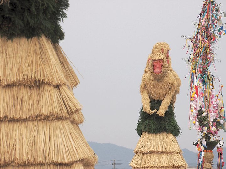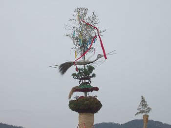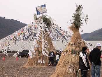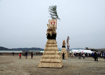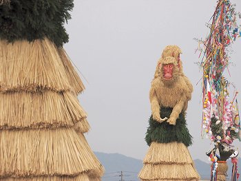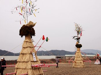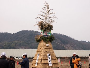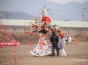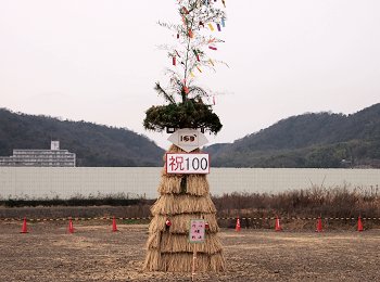14日の申の刻に本庄村前地に持ち出して火をかけ「どんどやどんどや明年もござれや」、とくちぐちにはやしやきます。この時、こ餅を竹に包み、その火で焼き、人々わけて小正月を祝いました。また、この火に身体をあてると無病息災ですごせるとか、書きはじめを焼いて高く上がると書が上手になると言い伝えられています。