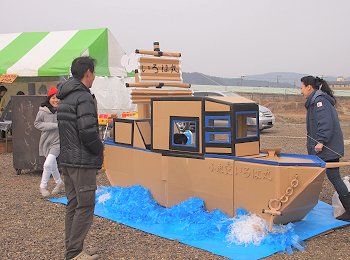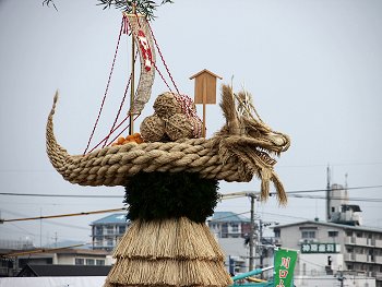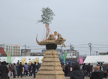 従って製造販売の虎屋さんの話だと当店も江戸期から続く古い店とのこと。「とんど祭」の間は直径30センチ位の特大の鰻頭を出して一息で食べたら景品を、といつたことを宣伝を兼ねた催しとして行ったこともあったそうだ。伏見町のように戦後出来た商店街は前述したように、「桃太郎」のようなものを「とんど」のモデルにしたが、古くからの町は伝統ある飾りつけの「とんど」が繰り出しそうだ。(船町―宝船、魚屋町―鯛 etc)