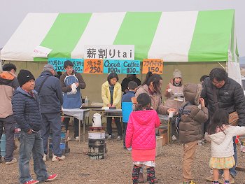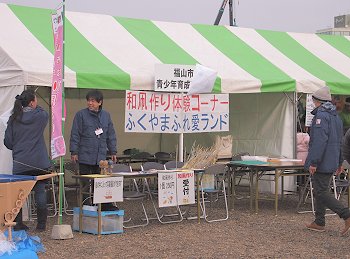 福山とんどうずみ、タイ・韓国など多国籍料理、コーヒー、焼き芋、フライドポテト、おでん、豚汁、おにぎり、餅つき大会(13:00〜、 15:00〜)、くわいうどんや新鮮なとれたて野菜の販売など。