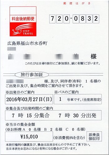 その際に、昼食にはA〜Cコースがありますようで、B・Cを選択しますと追加料金が必要ですから、その追加料金2名分と同伴者料金の計15,010円の支払いを終え、受け付け終了。乗車となりました。