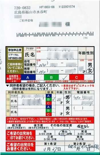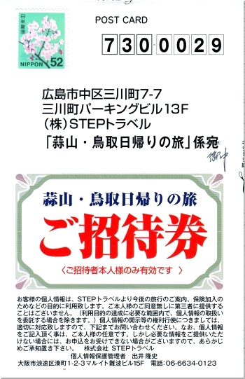 昨年の年末近く、ハローズsanで頂いた「花旅『秀峰大山を望むとっとり花回廊と神話の国出雲路を尋ねて』」応募ハガキを投函しておりました嫁さん。