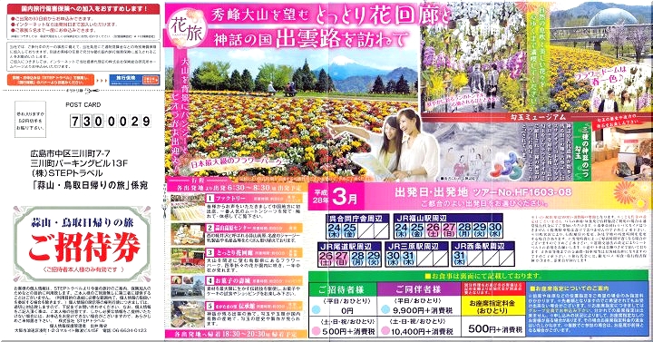ふ〜ん、との想いで眼を通しておきましたけど、3/26(日)に嫁さんに同伴で「慨TEPトラベル『蒜山・鳥取日帰りの旅』」に参加となりました。