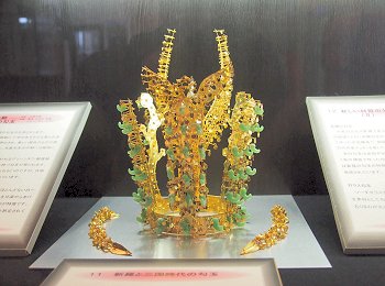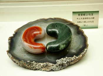 「古事記」にはスサノオノミコトがヤマタノオロチを退治した後、玉造の勾玉をアマテラスオオカミに献上し、これが皇位継承の印である三種の神器の一つ「八尺瓊勾玉」になったと記されています。謎めいた形と深く美しい色あい。今も人々を魅了し、不思議な霊力さえ感じさせる勾玉。
