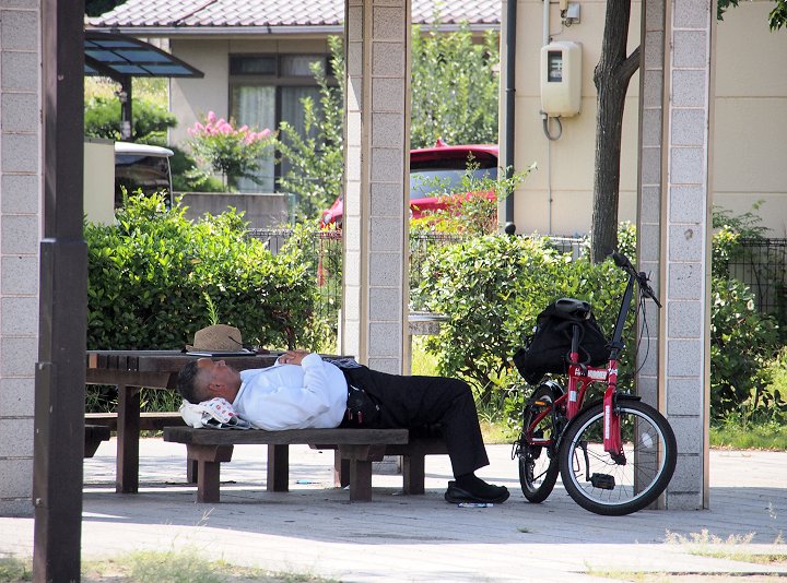 我が家近くに戻って来まして公園内に眼を向けますと、男性お一人がベンチで気持ち良さそうにお昼寝です(^_^)v