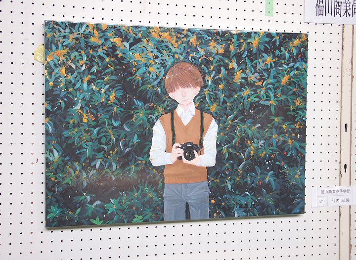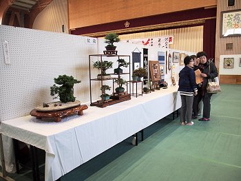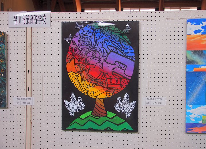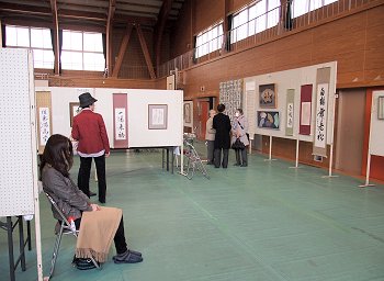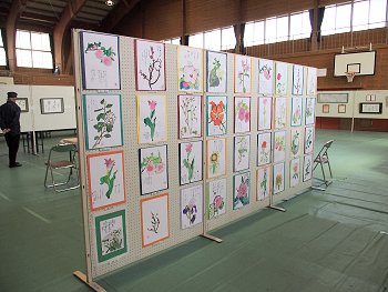 体育館内には、洋画、陶・工芸・盆栽、生け花・写真、書・短歌・川柳・文献、六方学園・サンスクエア・エクセル・なの花作業所・若草園、手芸、福山商業・手芸、向丘中学校、さおり織、小学6年生、日本画展…等の数々の作品の展示です。