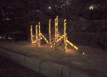 福山とんど実行委員会の協力を得て、福山市内7学区にとんど制作を依頼。福山城天守閣広場に7基設置し、ライトアップします。竹あかりについては、熊本を拠点として全国で活躍中の竹あかり演出家「ちかけん」を招きプロデュースしていただきます。また、JR福山駅北口の噴水広場周辺もLEDイルミネーションを実施します。