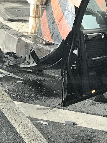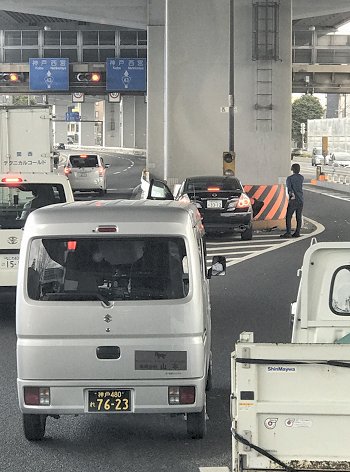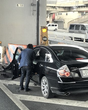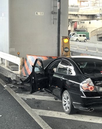 阪神高速3号神戸線で友人特派員が走行中、2〜3台先を走行中の乗用車が、結構なスピードで分岐の真ん中に突っ込まれましたようです。