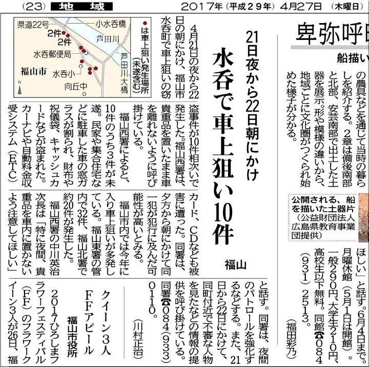 中国新聞sanの今日の朝刊記事…「水呑で車上狙い10件」に思わず眼が止まってしまいました(^-^;