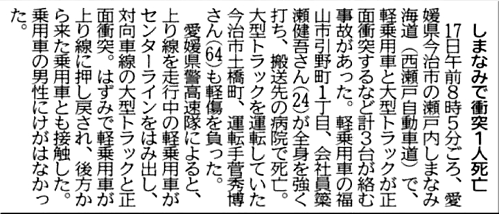 この日の様子はまた後日、この絵日記に綴りたいと思いますけど、対面通行の「しまなみ海道」ですから、事故現場を通過時にはチョッと身構えてしまいましたネ。