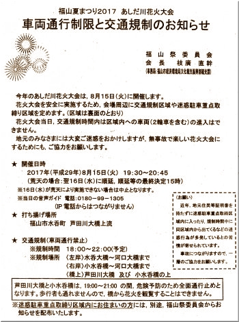 本日帰宅しますと、また「あしだ川花火大会」関係の案内が…