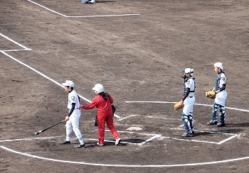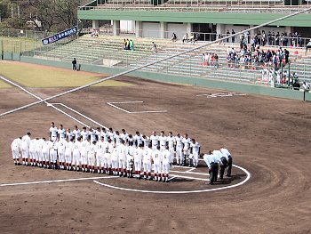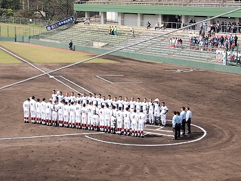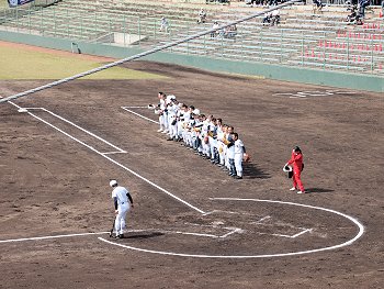 両チームが整列し、そして選手・審判員の皆様が一礼の挨拶後、後攻の選手が守備位置に走り試合開始と思っておりましたが、いぇいぇこれは誤りでありました(^-^)