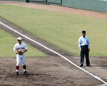 試合前の両チームの練習も終わり、スコアボードの時計に眼を向けますとA.M.09:57でしたが、定刻に「三原×府中」の試合開始。