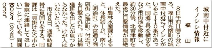 何日か前にも宮通り等にイノシシが出没しました際に、それ以降の足取りは不明との記事掲載でありました。