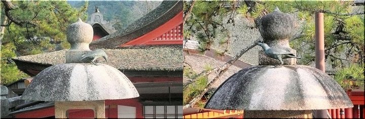宮島の厳島神社の回廊入口には、明治34(1901)年銘のある「御嶋廻」と刻まれた石灯籠が立っています。その笠には烏(からす)のブロンズ像が乗っています。この烏こそ、宮島の神の使いとされた動物なのです。