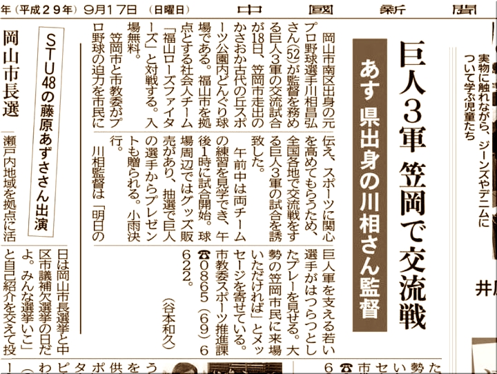 9/17(日)の中国新聞に、9/18(月)に笠岡市で「巨人3軍×福山ローズファイターズ」交流戦開催の記事掲載がありました。