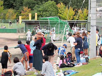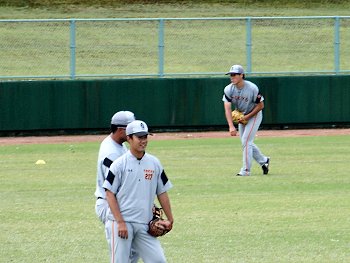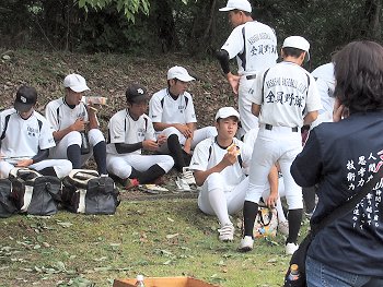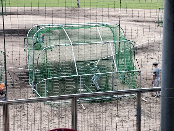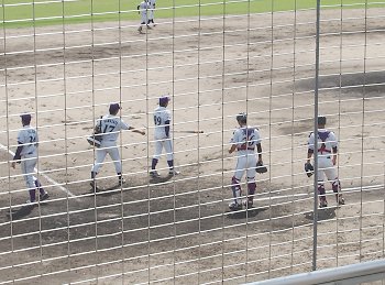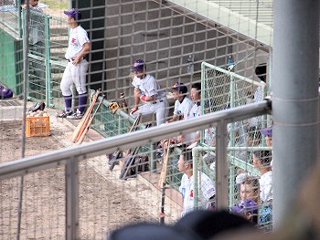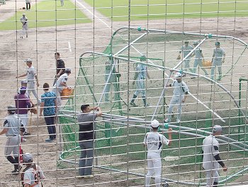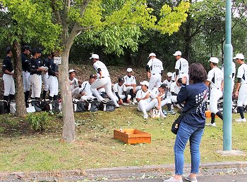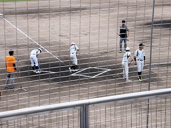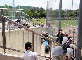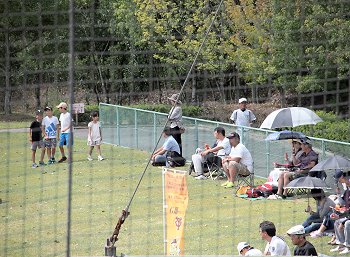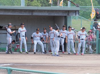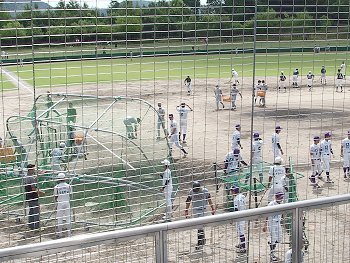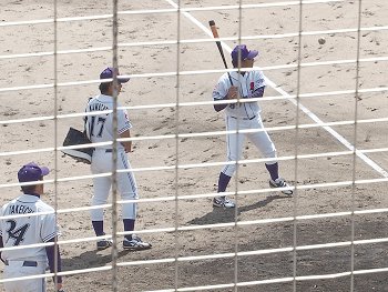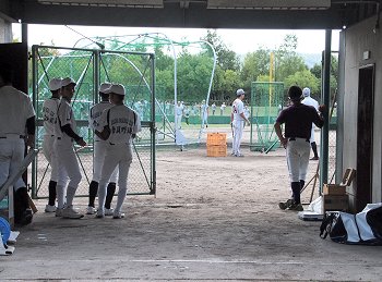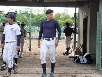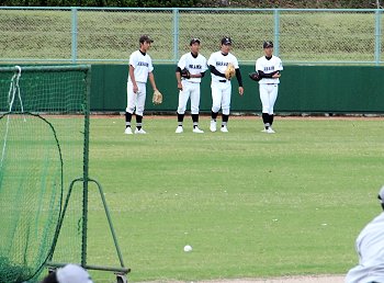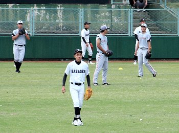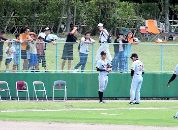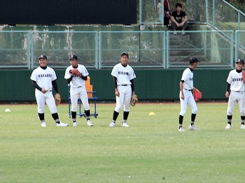 グランド内には、ユニフォームに「KASAOKA」と記載の方々が…ふ〜ん、笠岡商業高校の野球部の皆様が、試合前練習のお手伝いと言う訳ですネ(^.-)☆