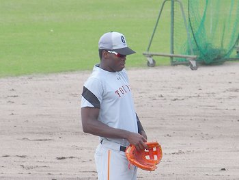 3塁の選手がシートノックのゴロを捕球し1塁へと送球したのですけど、これがとんでもない暴投です。