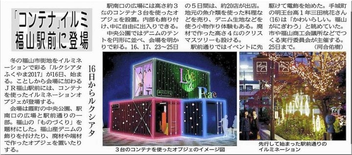 今回は、JR福山駅南口にコンテナ3台を使用しましたルミネーションが登場。ですから、今回は福山駅南口から散策開始となりました。
