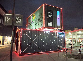 コンテナをアップサイクルしたイルミネーションオブジェは、ロンドンのボックスパークをイメージした外装。日中はクールでシック。夜は驚きのイルミネーションに様変わりします。