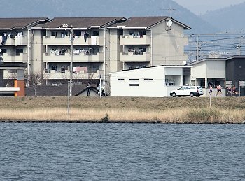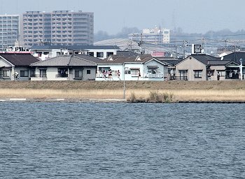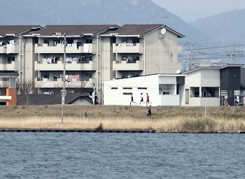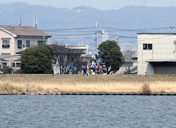 ハーフの部は、河口堰〜小水呑橋間を2周してから箕沖に向かいますけど、1周目のトップグループの選手がヤッて来られました(^.-)☆